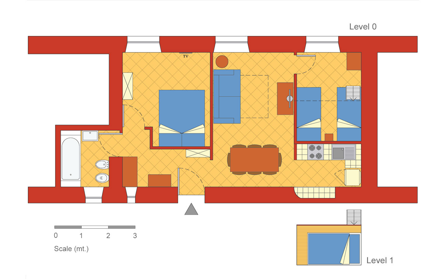 The cosy home is made up of 5 distinct rooms. Upon entering the apartment on the 2nd floor (with elevator access), you enter into the entrance vestibule. On your right is the living room with dining table and kitchen. The living room features a pull-out sofa bed which can accommodate 2 guests. Off the living room is the triple bedroom with 3 single beds (one of which is lofted and accessibly by a steel ladder). On the left from the entrance vestibule is the bath with bathtub and antique tiles. Finally the double bedroom features a queen sized bed, wardrobe and separate TV.